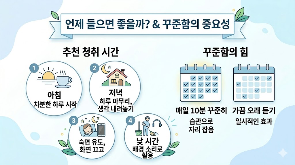 | 듣는 시간 | 아침, 저녁, 취침 전 | 생활 리듬에 맞추기 좋음 |