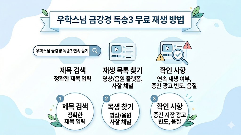 가장 쉬운 방법은 검색창에 정확한 제목을 입력하는 것입니다. “우학스님 금강경 독송3 연속 듣기”라고 검색하면 관련 영상이나 재생 목록을 찾을 수 있습니다. 무료 재생이 가능한 경우가 많고, 연속 듣기 형태로 이미 정리된 자료도 쉽게 보입니다.