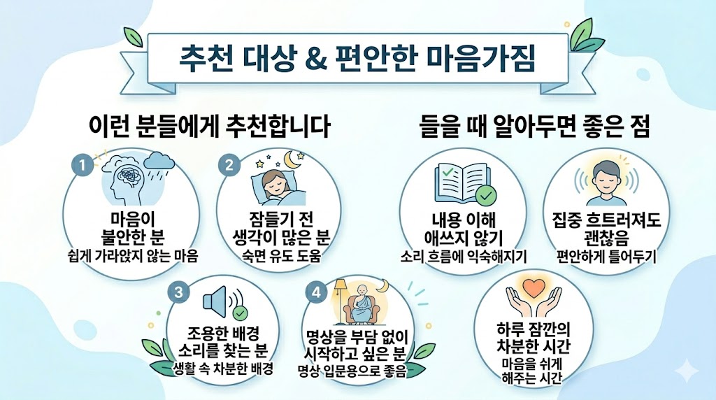 마음이 쉽게 가라앉지 않는 분, 잠들기 전에 생각이 많은 분, 조용한 배경 소리를 찾는 분, 명상 입문을 부담 없이 시작하고 싶은 분에게 잘 맞습니다. 또 종교적 의미를 깊게 알지 못하더라도 차분한 독송을 통해 심리적 안정을 얻고 싶은 분에게도 좋은 선택이 될 수 있습니다.