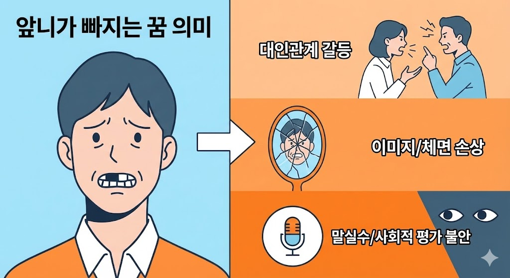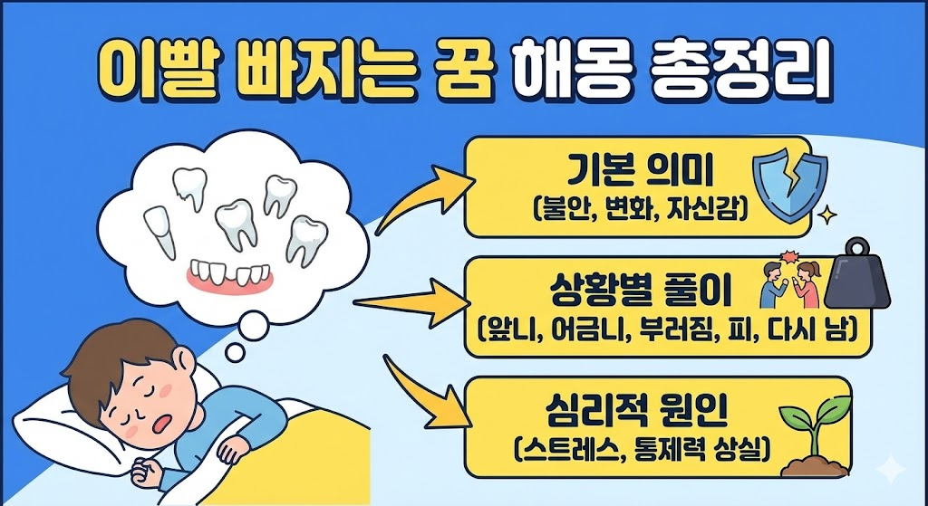 이빨 빠지는 꿈은 불안, 변화, 자신감과 깊이 연결된 상징적 장면이다. 앞니는 인간관계, 어금니는 책임과 기반, 부러짐은 자신감 저하를 의미하는 경우가 많다. 피가 나거나 다시 나는 장면은 감정 소모 또는 회복을 상징하기도 한다.