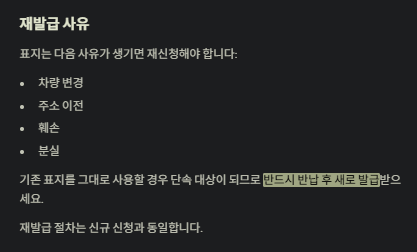 - 차량을 바꾸거나 폐차할 경우, 기존 표지는 반드시 반납해야 합니다.