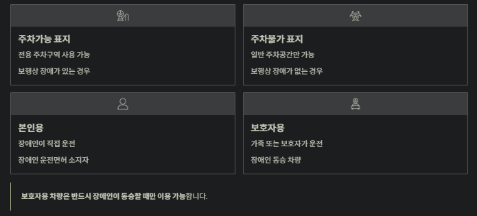 | 주차가능 표지 | 전용 주차구역 사용 가능 | 보행상 장애가 있는 경우 |
