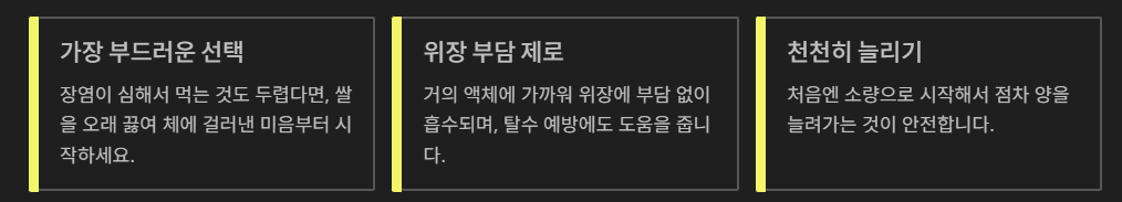 장염이 심해서 먹는 것도 두렵다면, 쌀을 오래 끓여 체에 걸러낸 '미음'부터 시작하는 것이 좋습니다. 거의 액체에 가까워 위장에 부담 없이 흡수될 수 있고, 탈수 예방에도 도움을 줄 수 있어요. 처음엔 소량으로, 천천히 늘려야 합니다.