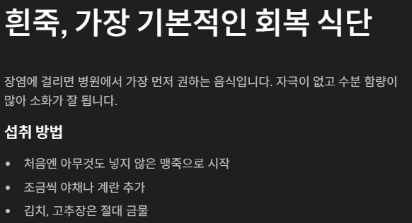 장염은 누구에게나 올 수 있는 흔한 질환이지만, 식단을 잘못 선택하면 증상이 더 길어질 수 있습니다. 먹지 않으면 더 나빠지고, 먹더라도 자극적인 음식을 피해야 하죠. 이번 글을 정리하면서 느낀 점은 속이 불편할 땐 몸이 원하는 음식과 텍스처를 잘 살펴야 한다는 것이었습니다. 익히고, 담백하게 조리하고, 자극 없이 천천히. 이 세 가지 원칙만 기억해도 회복이 훨씬 빨라질 수 있습니다.