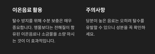 탈수 방지를 위해 수분 보충은 매우 중요합니다. 맹물만 마시는 것보다 전해질이 함유된 이온음료나 소금물 등을 소량 마시는 것이 더 효과적일 수 있어요. 단, 당분이 높은 음료는 오히려 탈수를 유발할 수 있으니 성분을 확인해야 합니다.