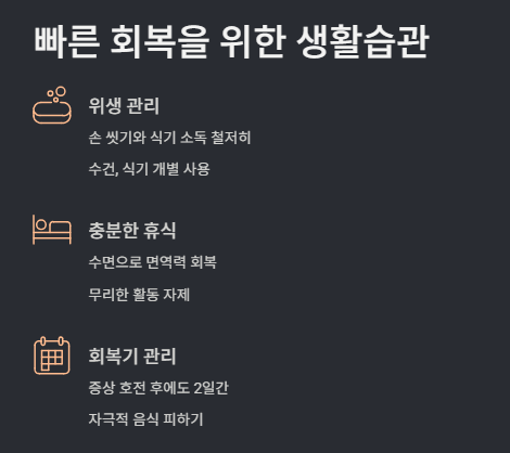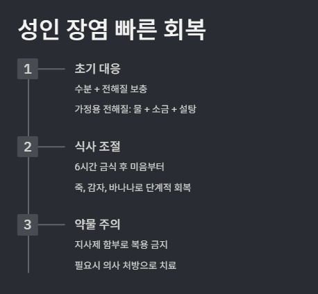 • 심한 경우 의사 처방으로 항생제, 수액치료 병행