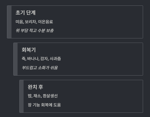 • 이후 죽, 삶은 감자, 바나나 등으로 단계적으로 식사 회복