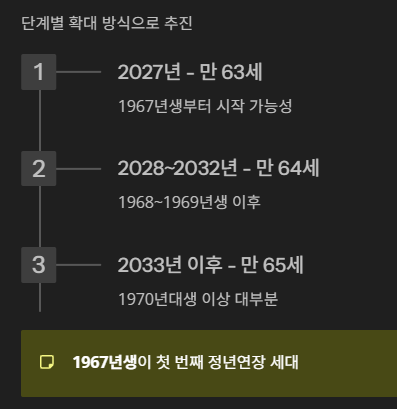 이 계획이 확정된다면 1967년생이 첫 번째 정년연장 세대가 될 전망입니다. 이어서 매년 단계적으로 1세씩 늘어나는 방식이 적용될 가능성이 높습니다.