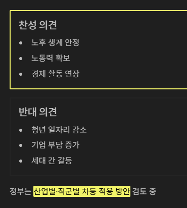 찬성 측은 “노후 생계 안정과 노동력 확보에 도움이 된다”고 말합니다. 반면 반대 측은 “청년층의 일자리 기회가 줄어들고 기업 부담이 커진다”고 지적합니다.