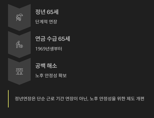 이러한 점에서 정년연장은 단순히 근로 기간 연장이 아니라, 노후 안정성을 위한 제도 개편으로 해석할 수 있습니다.
