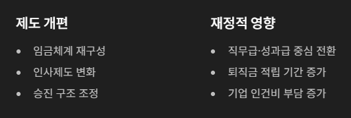 특히 연공서열 중심의 기업에서는 인건비 부담이 커질 수 있으므로, 직무급제나 성과급 중심의 구조 개편이 병행될 가능성이 큽니다.