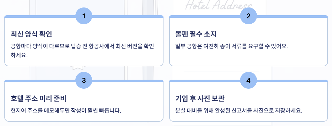 공항마다 양식이 다르므로, 탑승 전 항공사에서 최신 버전 확인 - 볼펜 필수 소지
