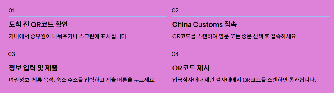 2025년부터 대부분의 중국 공항에서는 QR코드로 입국신고를 대체할 수 있는 시스템이 도입되었습니다.