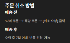 • 배송 전: ‘나의 주문’ → 해당 주문 → [취소 요청] 클릭