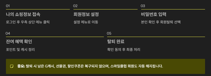 이 과정을 마치면 회원정보가 삭제되며, 스마일클럽 회원도 자동 해지됩니다. 단, 탈퇴 시 남은 G캐시나 선물권, 할인쿠폰은 복구되지 않으니 꼭 확인하세요.