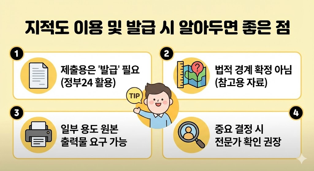 지적도 발급본은 기관 제출이나 계약 참고용으로 활용되며, 일부 용도에서는 원본 출력물을 요구하는 경우도 있습니다.