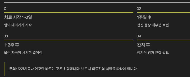 치료는 항생제 복용이 핵심입니다. 독시사이클린이나 아지스로마이신 계열 약을 7~14일 정도 복용하면 대부분 호전됩니다. 치료를 시작하면 하루 이틀 안에 열이 내려가며, 1~2주 후 서서히 옅어집니다.