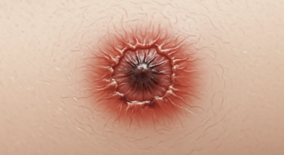 처음에는 작은 종기처럼 보이지만 시간이 지나면 가운데가 검게 변하며 궤양처럼 움푹 파이는 특징이 있습니다. 바로 쯔쯔가무시병의 대표적인 단서이기 때문에 조기 발견이 중요합니다.