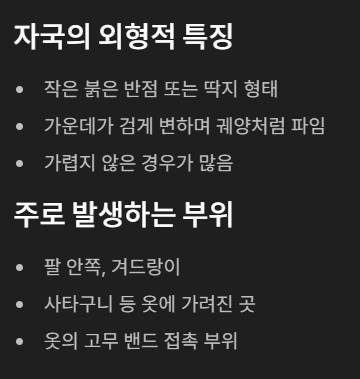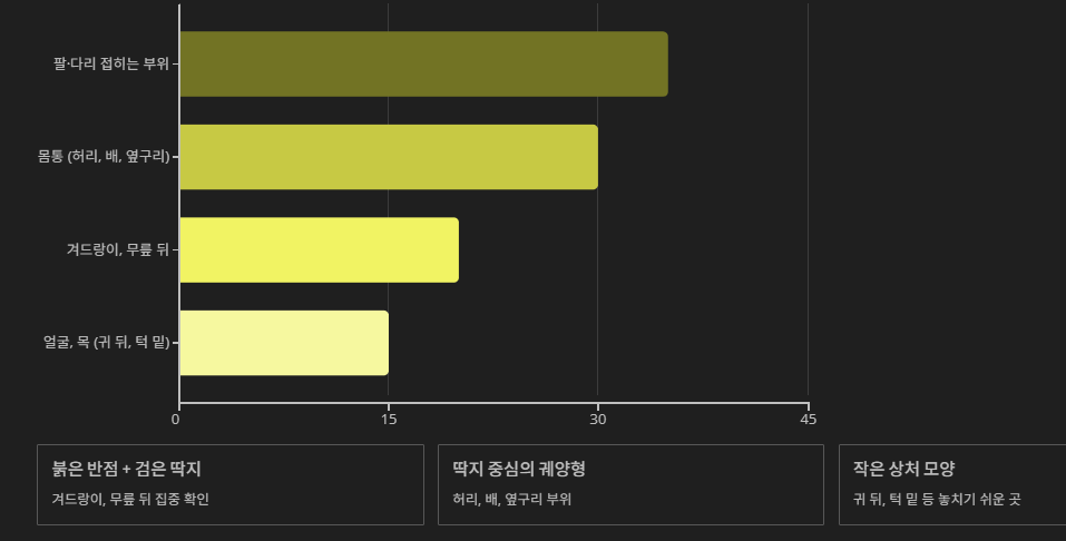 | 팔 · 다리 접히는 부위 | 겨드랑이, 무릎 뒤 | 붉은 반점 + 검은 딱지 |