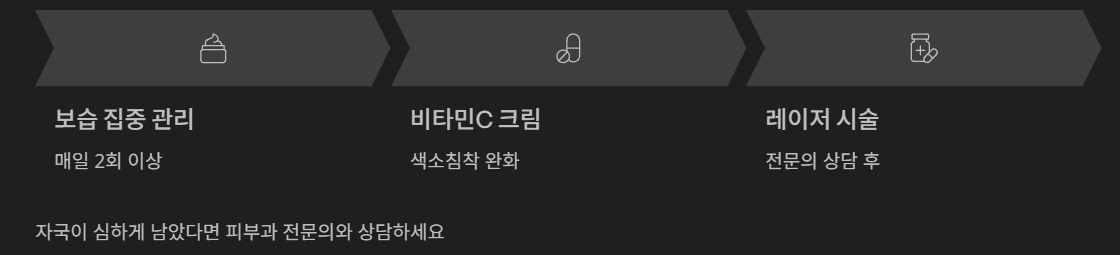 A. 충분한 보습과 자외선 차단이 중요하며, 색소침착이 지속될 경우 피부과 전문의의 진료를 받는 것이 좋습니다.