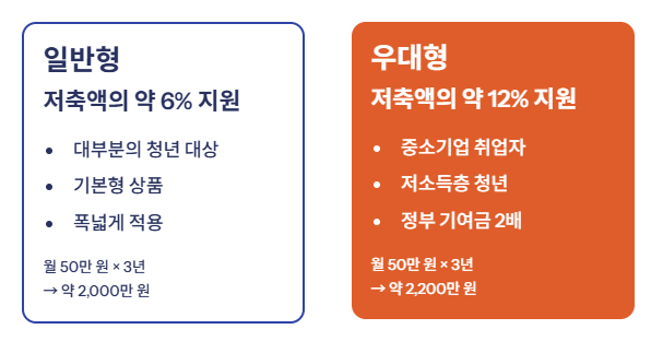 예를 들어 월 50만 원씩 3년간 납입 시, 일반형은 약 2,000만 원 / 우대형은 약 2,200만 원이 됩니다.
