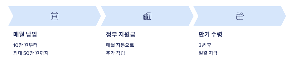 3년 동안 꾸준히 납입하면 원금 + 이자 + 정부지원금을 한꺼번에 받을 수 있어 목돈 마련에 큰 도움이 됩니다.