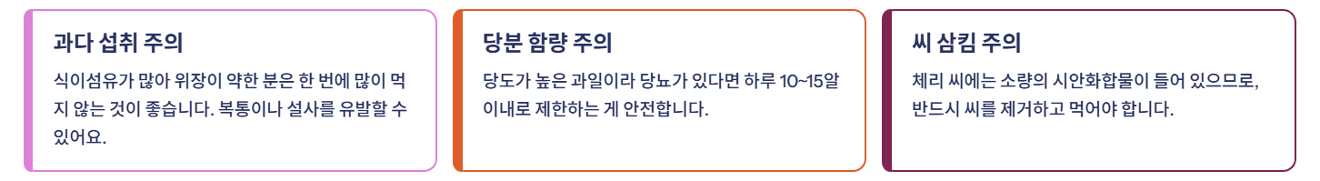 3. 씨 삼킴 주의 – cherry 씨에는 소량의 시안화합물이 들어 있으므로, 반드시 씨를 제거하고 먹어야 합니다.