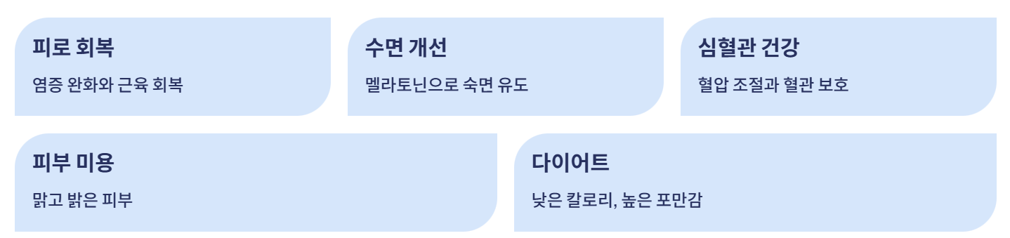 또한 비타민 C, 칼륨, 식이섬유, 멜라토닌 등이 들어 있어 면역력과 수면 개선에도 도움을 줍니다.