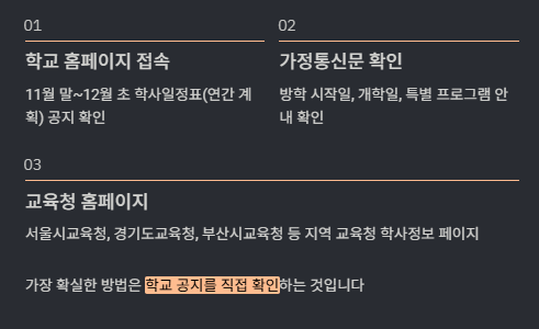 대부분은 매년 11월 말~12월 초에 학사일정표(연간 계획)를 공지하며, 거기에서 방학 시작일과 개학일을 알 수 있습니다.
