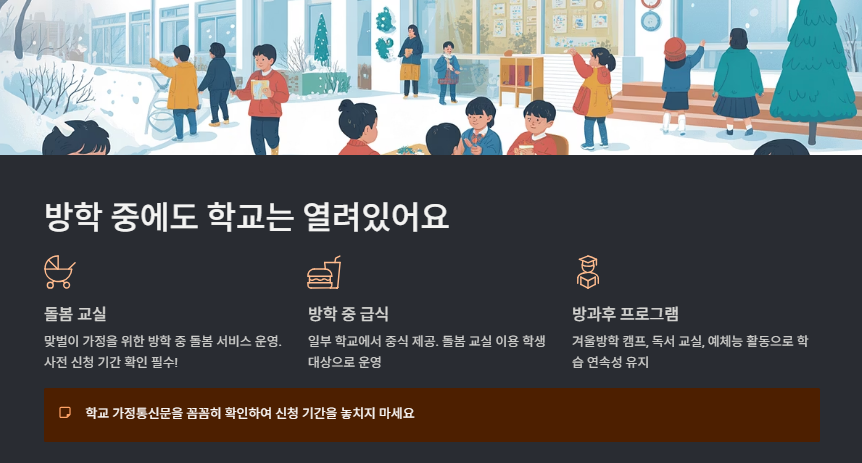 특히 맞벌이 가정을 위해 운영되는 방학 중 돌봄 서비스는 신청 기간이 있으므로 가정통신문을 꼼꼼히 확인해야 합니다.