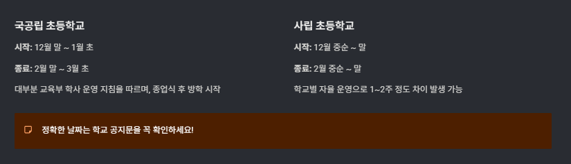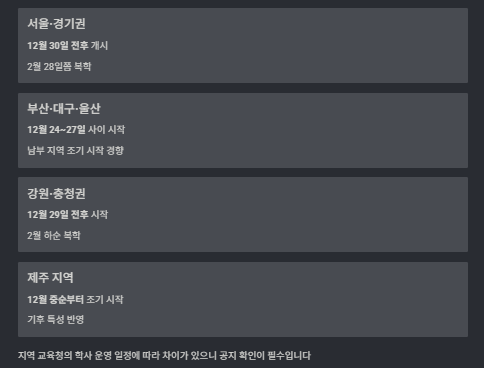 • 제주 지역: 12월 중순부터 조기 시작하는 학교도 있음