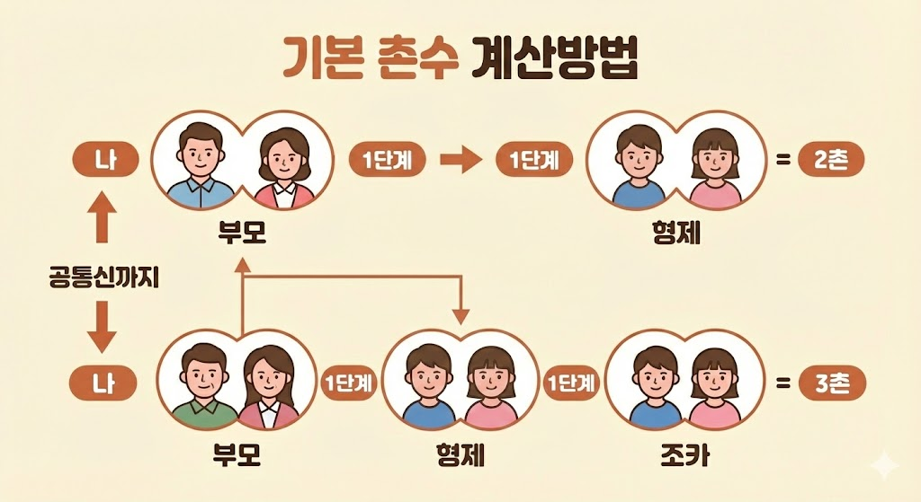 촌수는 나를 기준으로 부모를 거쳐 상대까지 이어지는 단계 수를 말합니다. 한 단계 올라가거나 내려갈 때마다 1촌씩 더해집니다. 기준은 항상 ‘나’입니다.