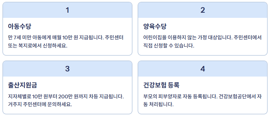 | 아동수당 | 만 7세 미만 아동 월 10만 원 | 주민센터 또는 복지로 |