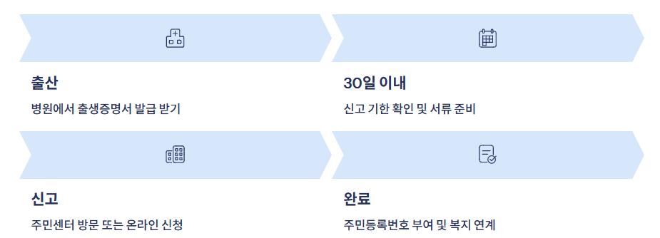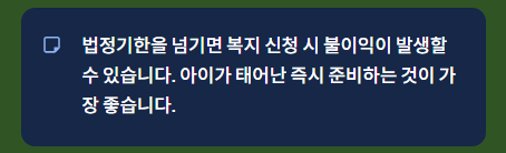 ※ 법정기한을 넘기면 복지 신청 시 불이익이 발생할 수 있으므로, 아이가 태어난 즉시 준비하는 것이 가장 좋습니다.