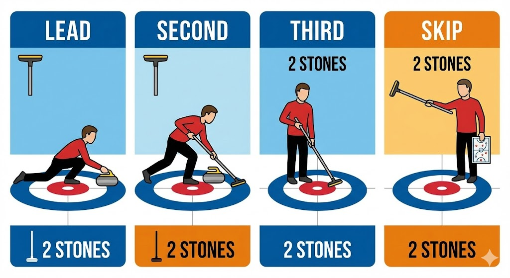 컬링규칙 이해에는 포지션 역할 파악이 중요하다. 각 선수의 역할이 다르다.