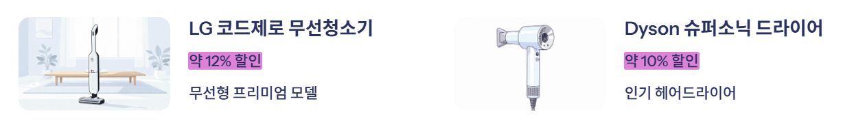 | LG 코드제로 무선청소기 | 약 12% | 무선형 프리미엄 모델 |