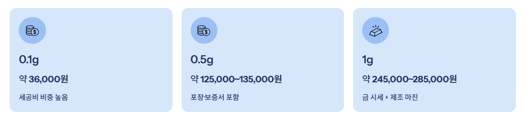 1g 245,000원 ~ 285,000원 금 시세 + 제조 마진 반영