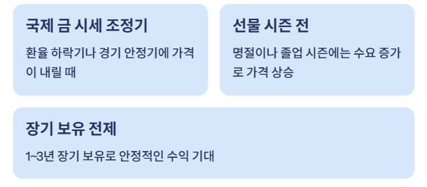 – 반드시 “순도 99.9% (24K)” 표기 및 보증서 포함 여부를 확인해야 합니다.
