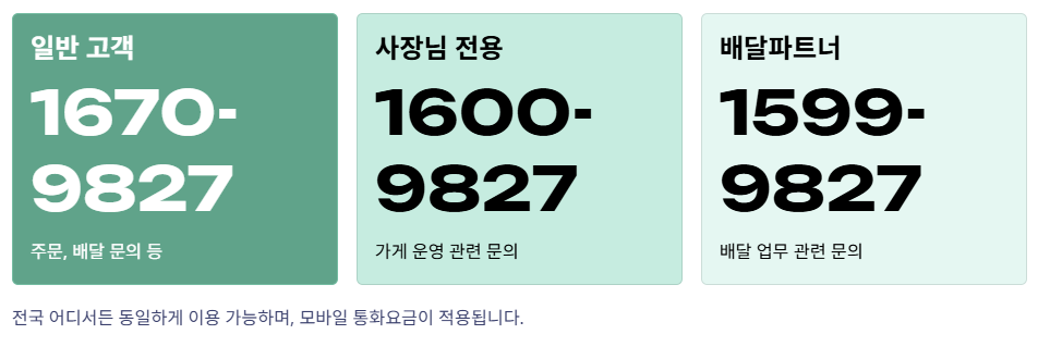 일반 이용자는 이 번호로 문의하면 되며, 사장님이나 배달파트너는 아래 전용 번호로 연락해야 합니다.