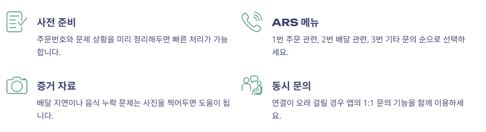 - ARS 연결 후 ‘1번 주문 관련’, ‘2번 배달 관련’, ‘3번 기타 문의’ 순으로 선택 가능합니다.