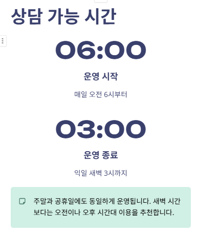 다만 새벽 시간에는 상담 대기 시간이 길어질 수 있으니 오전이나 오후 시간대를 추천드립니다.