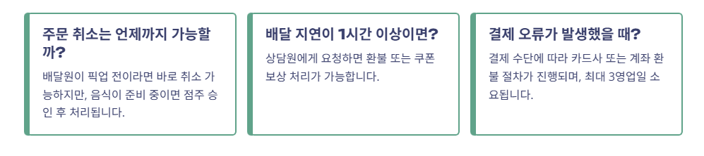 - 배달 지연이나 음식 누락 문제는 사진을 찍어두면 도움이 됩니다.