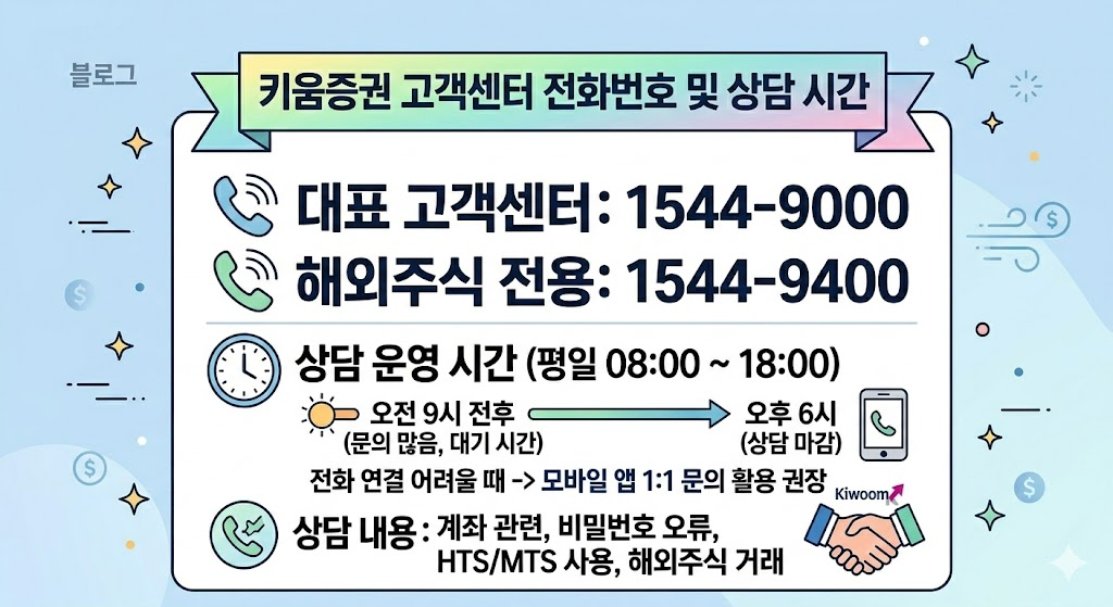 상담 운영 시간은 평일 오전 8시부터 오후 6시까지입니다. 장 시작 직후인 오전 9시 전후, 그리고 장 마감 시간에는 문의가 많아 대기 시간이 길어질 수 있습니다. 계좌 개설 문의, 비밀번호 오류, HTS와 MTS 사용 방법, 해외주식 거래 문의까지 대부분 이 번호로 연결됩니다.