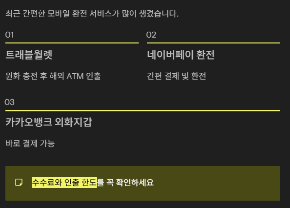 최근에는 트래블월렛, 네이버페이 , 카카오뱅크 외화지갑 등 간편한 모바일 서비스도 많습니다.