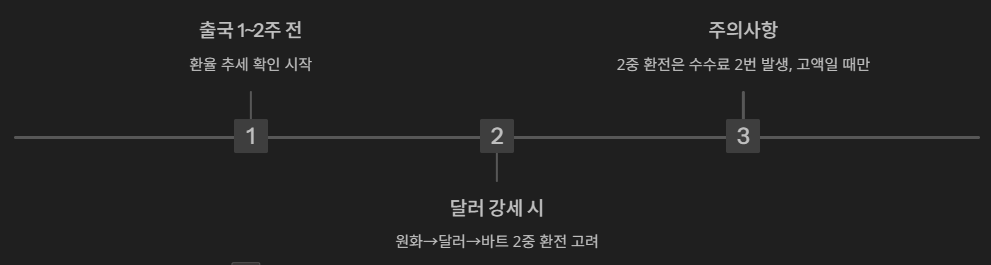 단, 2중 환전 시 수수료가 2번 발생하므로 금액이 클 때만 선택하는 게 좋습니다.