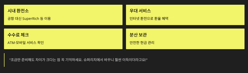 저도 예전에 아무 생각 없이 공항에서 했다가 손해 본 적이 있는데, 이번엔 슈퍼리치에서 바꾸니 훨씬 이득이더라고요.
