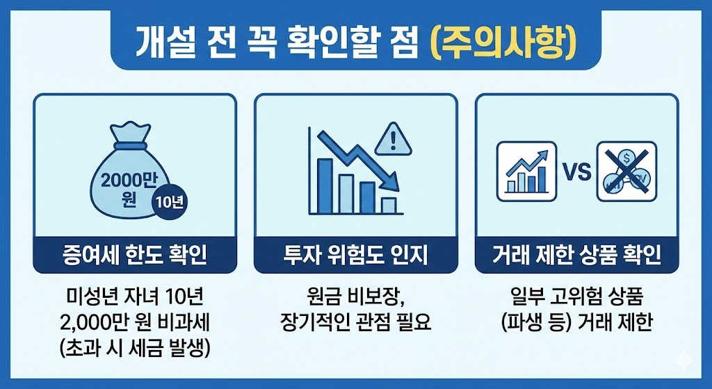 셋째, 미성년자 계좌는 일부 고위험 상품 거래가 제한될 수 있습니다. 국내·해외 주식은 가능하지만 파생상품 등은 제한되는 경우가 많습니다.