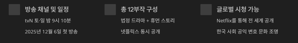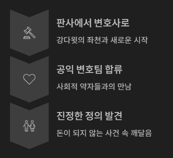단순한 법정 스토리가 아니라, 세상을 따뜻하게 바꾸는 사람들의 성장기를 그립니다.