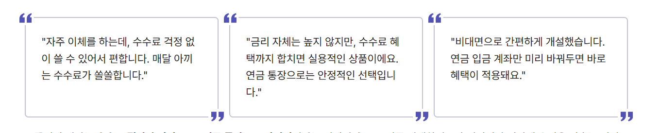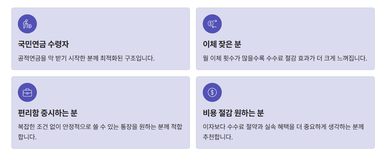 특히 연금을 받는 고객에게 맞춘 구조라는 점에서 실용성이 높다고 느껴졌습니다. 일상적인 금융 거래에서 비용을 줄일 수 있다는 점이 큰 장점입니다.