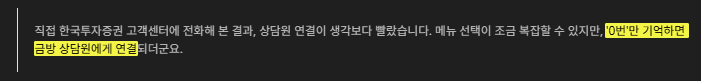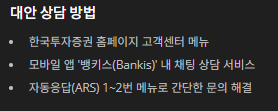 통화가 많을 시간대에는 상담원 연결이 지연될 수 있습니다. 이럴 땐 한국투자증권 홈페이지 고객센터 메뉴 또는 모바일 앱 ‘뱅키스(Bankis)’ 내 채팅 상담 서비스를 이용하면 조금 더 빠릅니다.